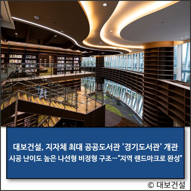 대보건설 관계자는 "경기도서관은 타원형의 비정형 구조로 시공 중기술적 난이도가 매우 높은 건축물이었지만 지역을 대표하는 랜드마크로 자리매김 할 수 있도록 정성을 다했다"며 "대한민국의 미래를 이끌어갈 어린 세대들이 잠재력을 발휘 할 수 있는 창의적인 공간을 완성했다는데 자부심을 느낀다"고 말했다.