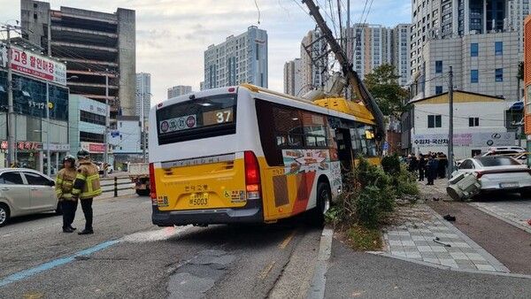30일 오후 4시55분께 광주 서구 농성동 서구청 앞 편도 3차선 도로에서 시내버스가 전봇대와 가로수를 잇따라 들이받았다.