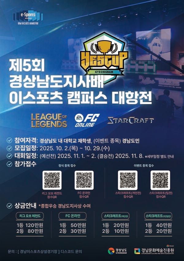 경남 최강 이스포츠 대학을 가리는 경남문화예술진흥원 주관 '제5회 경남도지사배 이스포츠 캠퍼스 대항전'이 11월1일 경남 이스포츠 상설경기장에서 개막한다.