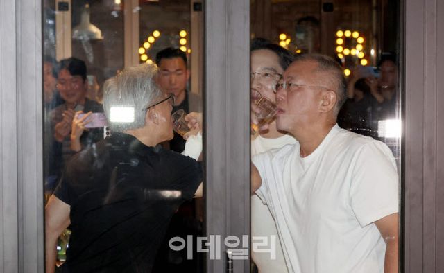 이날 이 회장은 “밖에 나가서 치맥을 한 지가 10년 정도 된 것 같다”며 “주로 집에서만 먹었다”고 했다. 정 회장도 황 CEO에게 “이렇게 (이 회장과 함께) 치맥을 먹는 건 처음”이라며 “(젠슨 황) 덕분이다”며 웃었다. 셋은 정 회장의 제안에 ‘러브샷’을 하기도 했다.
