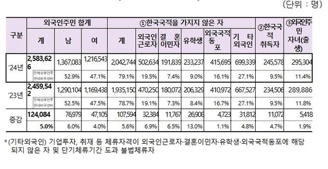 분석 결과에 따르면 2024년 11월 1일 기준, 3개월을 초과해 국내에 장기 거주한 외국인주민 수는 총 258만 3,626명으로 나타났다.