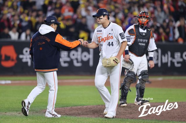 한화는 4-1, 3점 앞선 채 9회 초 수비를 맞이했다. 8회 2사 1·2루 위기에서 오스틴 딘을 뜬공 처리하며 1차 임무를 잘 해낸 마무리 투수 김서현이 다시 마운드에 올랐다. 하지만 그가 오지환에게 볼넷, 박동원에게 투런홈런을 맞고 1점 차 추격을 허용했다. 김경문 감독은 그를 바로 교체하지 않았다. 김서현은 천성호를 땅볼 처리했지만 이어진 박해민과의 승부에서 볼넷을 내주며 동점 주자를 내줬다. 한화는 뒤늦게 박상원을 교체 투입했지만 그가 홍창기에 안타, 신민재에게 진루타를 허용하며 2·3루에 놓였고 김현수에게 역전 우전 안타를 맞았다. 4-5로 역전을 허용한 뒤에도 박상원은 마운드를 지켰고 문보경에게 추가 안타를 허용했다. 이 상황에서 이닝 3번째 투수로 나선 한승혁도 오스틴에게 좌전 안타를 맞았다. 한화는 9회 공격에서 득점에 실패했다. 이제 1패만 더하면 우승 트로피를 LG에 내준다. 경기 뒤 김경문 감독은 "야구가 정말 어렵다"라고 했다.