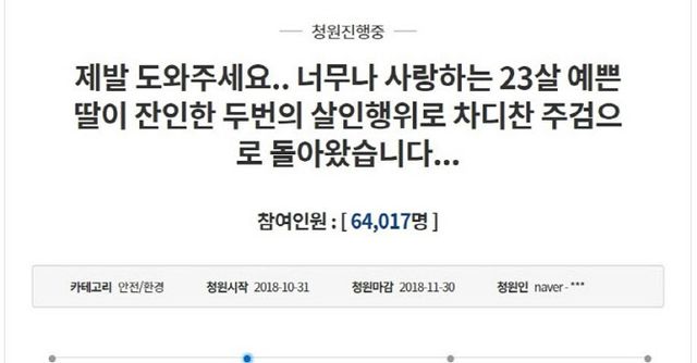 2018년 10월 31일 당시 청와대 국민청원 홈페이지에는 상견례를 앞두고 연인을 잔인하게 살해한 뒤 시신을 훼손한 ‘춘천 예비신부 살인사건’과 관련 유족들이 가해자 심모씨(당시 28세 ·남)를 엄벌에 처해야 한다며 신상공개에 대한 목소리를 높였다.