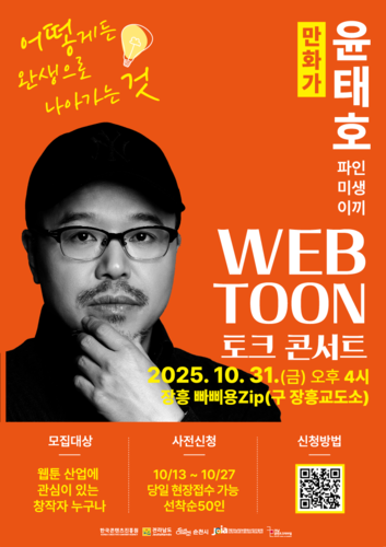 '웹툰 토크 콘서트'는 31일 오후 4시부터 2시간 동안 장흥 빠삐용Zip 연무장(영화로운 책방)에서 열린다. '미생', '이끼', '파인' 등으로 잘 알려진 윤태호 작가가 강연자로 나서 '꿈과 진로 사이, 웹툰 작가로 사는 자세'를 주제로 창작과정에서의 실패와 성장, 작가의 삶을 진솔하게 공유한다.