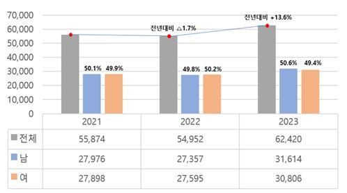 통계 연보 주요 내용을 보면 희귀질환 발생자 수는 희귀질환 산정 특례 등록 자료를 수집해 작성했으며 2023년 한 해 희귀질환 신규 발생자 수는 총 6만2420명으로 집계됐다. 전년보다 7468명 증가했는데 이는 '다낭성 신장, 보통염색체우성', '특발성 비특이성 간질성 폐렴' 등 42개 질환이 2023년 국가관리대상 희귀질환으로 새로 지정된 영향으로 분석된다.