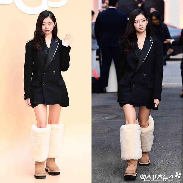 특히 시크한 상의와 반대로 포근한 느낌의 롱 부츠를 매치해 눈길을 끌었다. 발목부터 무릎 아래까지 올라오는 푹신한 양털 소재가 포인트인 부츠가 따뜻한 감성을 더했다.