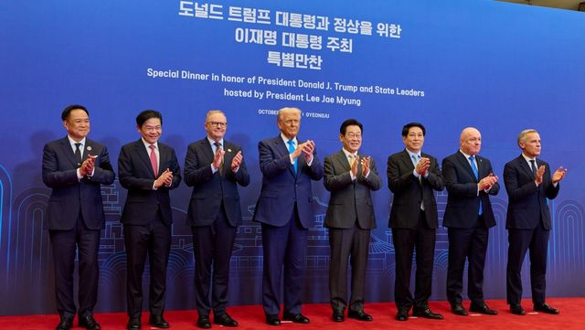 이재명 대통령이 지난 29일 경북 경주 힐튼호텔 그랜드볼룸에서 열린 대통령 주최 정상 특별만찬에 앞서 각국 정상들과 기념촬영을 하고 있다. 왼쪽부터 아누틴 찬위라꾼 태국 총리, 로런스 웡 싱가포르 총리, 앤서니 앨버니지 호주 총리, 도날드 트럼프 미국 대통령, 이 대통령, 르엉 끄엉 베트남 국가주석, 크리스토퍼 럭슨 뉴질랜드 총리, 마크 카니 캐나다 총리. / 대통령실 제공, 뉴스1