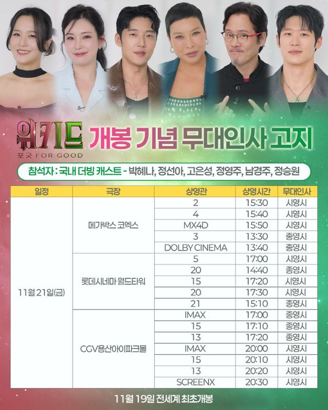이번 무대인사는 오는 11월 21일 메가박스 코엑스를 시작으로 롯데시네마 월드타워, CGV용산아이파크몰을 순차적으로 방문해 관객들과 직접 만나는 시간을 갖는다. 엘파바 역의 박혜나, 글린다 역의 정선아, 피예로 역의 고은성, 마담 모리블 역의 정영주, 마법사 역의 남경주, 보크 역의 정승원까지 한자리에 모이기 어려운 최정상 뮤지컬 배우들이 총출동해 특별한 만남을 예고한다. ‘위키드: 포 굿’의 한층 깊어진 이야기와 압도적인 스케일, 짙어진 감동과 더불어 국내 더빙 캐스트들의 무대인사가 관객들에게 다시 한 번 잊지 못할 원더풀한 순간을 선사할 것으로 기대된다. ‘위키드: 포 굿’의 무대인사에 관련된 자세한 내용은 유니버설 픽쳐스 공식 사회관계망서비스(SNS) 및 극장별 홈페이지, 앱에서 확인할 수 있다.