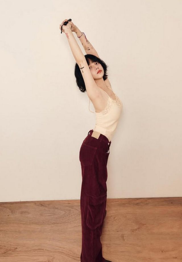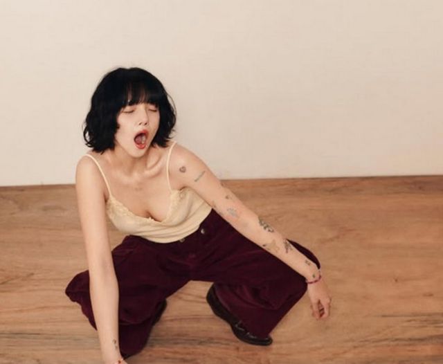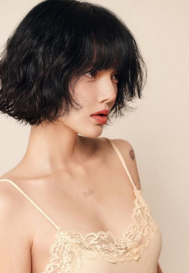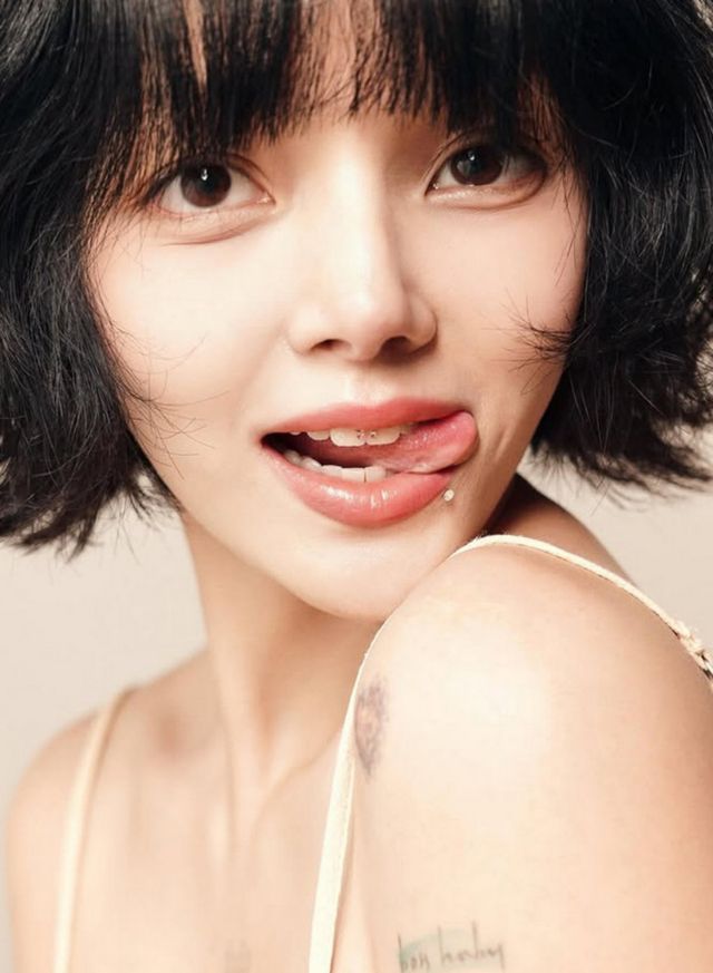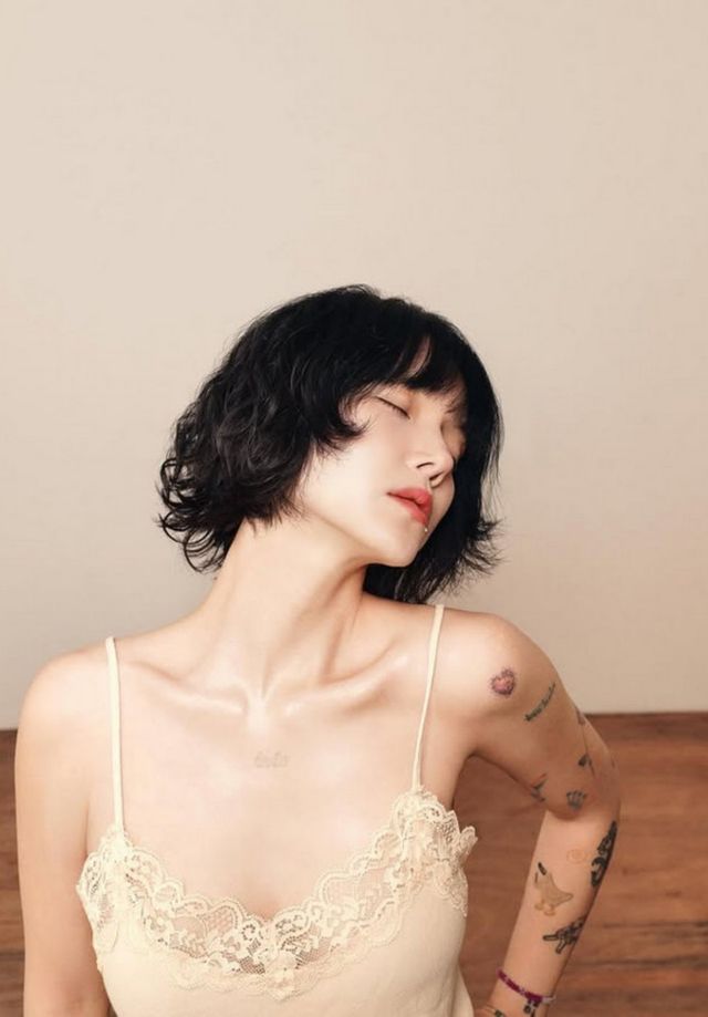 사진 속 지민은 레이스 민소매 속옷을 입고 팔 문신을 드러내며 다양한 포즈를 취하고 있다. 단발펌으로 낸 귀여운 분위기와 다르게, 개구지거나 도도한 표정이 눈길을 끈다.