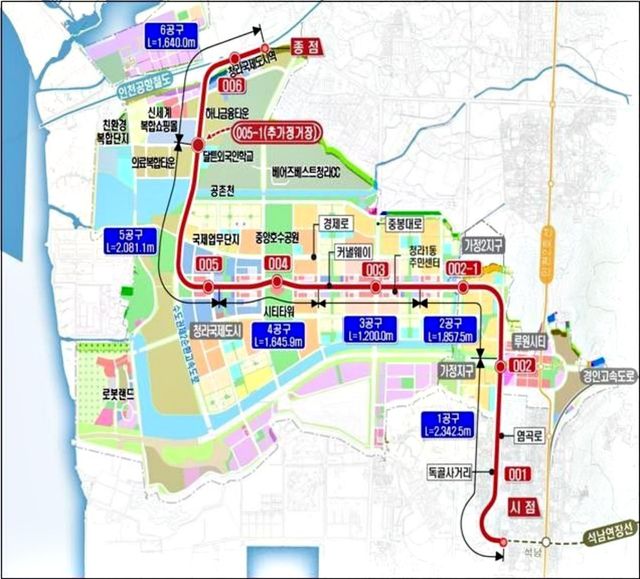 인천시는 전체 6개 공구(1~6공구) 가운데 1~5공구 구간(001~005정거장)을 2027년 하반기 우선 개통하고, 나머지 6공구(006정거장)와 추가 신설역인 005-1정거장(가칭 돔구장역)은 2029년 상반기 개통하는 2단계 방식을 추진하기로 했다.