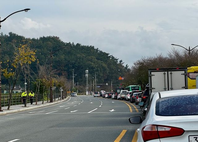 이른 아침, 보문단지 진입로 곳곳에 차량 행렬이 이어졌다. 취재, 관계자 차량이 차례로 검문을 받고 있다. = 김주환 기자