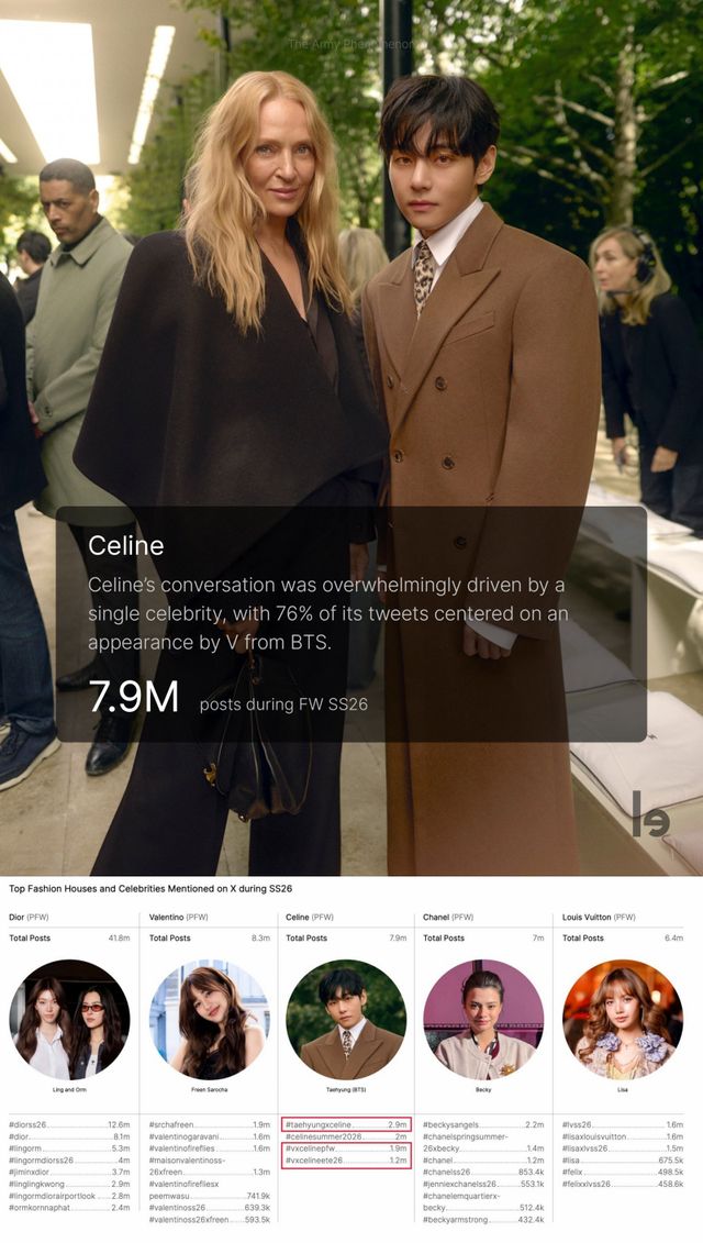 보고서에 따르면 밀라노와 파리 패션위크에서 트래픽이 집중됐으며, 뷔가 글로벌 앰버서더로 활동 중인 명품 브랜드 셀린느는 X에서 총 790만 개의 게시물을 기록했다. 이 중 76%인 600만 개가 뷔와 관련된 내용이었다.