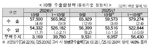 관세청은 10월 수출액이 595억 7000만달러로 지난해 같은 기간보다 3.6% 늘었다고 1일 밝혔다. 같은 기간 수입액은 535억 2000만달러로 1.5% 줄었고 무역수지는 60억 6000만달러 흑자를 기록했다.