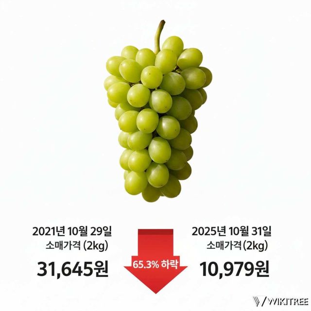 1일 한국농수산식품유통공사(aT)에 따르면 샤인머스캣 소매가격은 2kg 기준으로 2021년 10월 29일 31,645원이었으나, 2025년 10월 31일에는 10,979원까지 떨어졌다. 5년 사이 약 65.3% 하락한 수치다. 한때 명절 선물세트의 프리미엄 라인업을 차지하던 샤인머스캣이 이제는 대형마트에서 1만 원대에 팔리는 셈이다. 가격 하락 폭으로만 보면 사실상 폭락 수준이다.