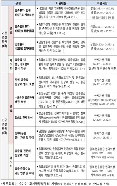 종료되는 항목은 지역 응급실 진찰료 별도 보상, 수용곤란 중증환자 배정 보상, 회송료 한시 인상, 신속대응팀 한시 가산 및 확대 등이다.