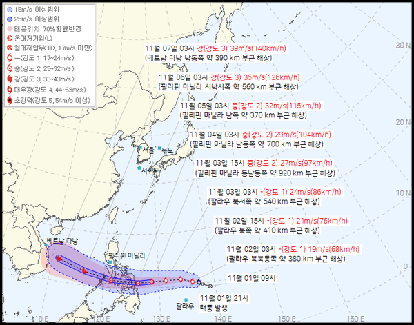 아울러, 오는 4일 03시경 필리핀 마닐라 동남동쪽 약 700km 부근 해상을 지나 오는 5일 03시경 필리핀 마닐라 남쪽 약 370km 부근 해상으로 이동하게 된다는 것이다.