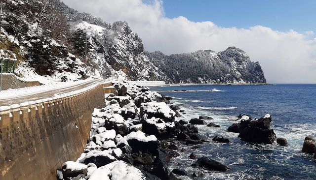 눈 내린 울릉도 바닷가 모습. 기사 이해를 돕기 위한 자료 사진.최근 울릉도서 1m급 대물급 무늬오징어가 잡혀 화제가 되고 있다. / 뉴스1