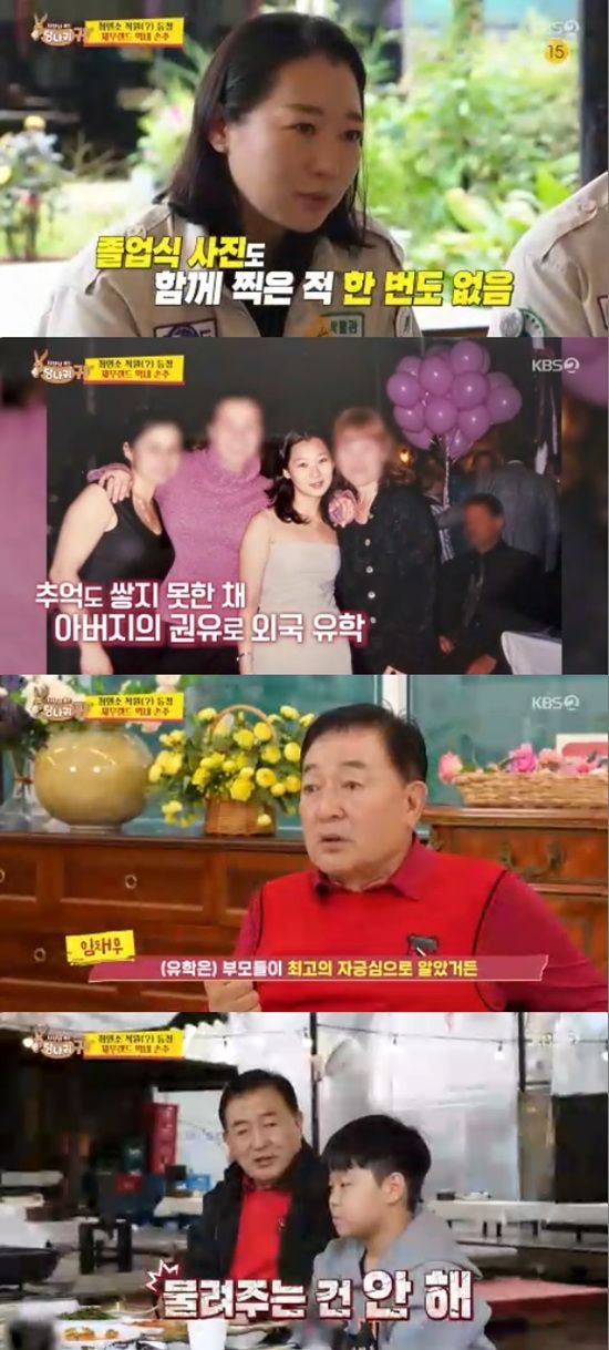 임채무는 "애들 유학 보낸 거 후회한다. 그때는 유학을 최고의 자긍심으로 알았다. 절대로 해서는 안 될 일이다. 추억거리가 없다. 그래서 부녀 간에 정이 없다"고 전했다.