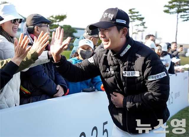 옥태훈이 1번 홀 티잉그라운드에세 갤러리와 하이파이브를 하고 있다./사진=KPGA