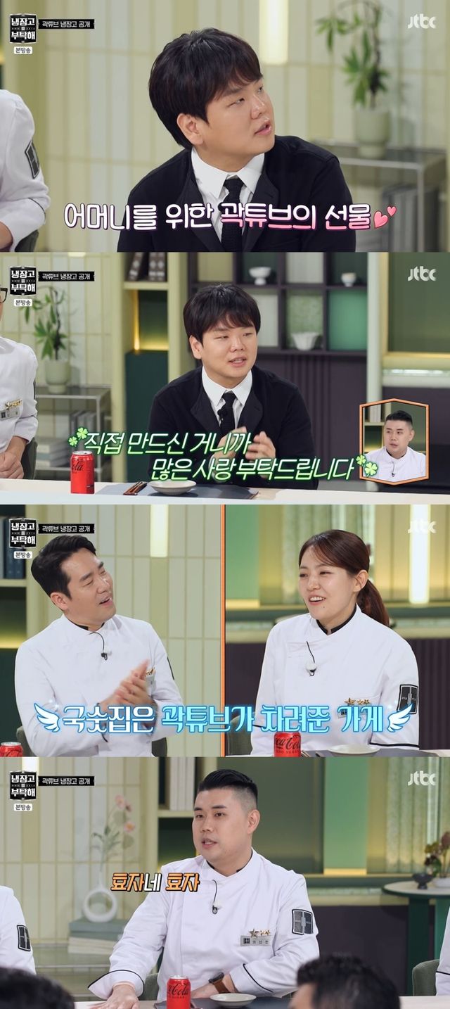 냉동고 속 정체불명의 육수를 발견한 MC들이 “이건 뭐냐”고 묻자, 곽튜브는 “어머니가 요즘 국숫집을 여셨다. 직접 개발하신 국수 육수다. 아내랑 장모님이 가서 먹었는데 너무 맛있다고 하더라. 그래서 어머니가 ‘아내 해주라’며 육수를 갖다놓으셨다”고 설명했다.