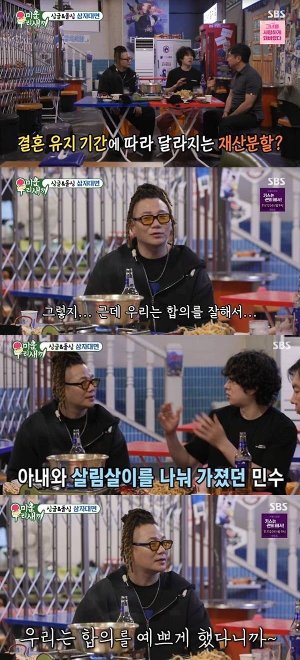 2일 방송된 SBS 예능 프로그램 '미운 우리 새끼'(이하 '미우새')에서는 이혼 경험이 있는 윤민수와 임원희, 그리고 김희철이 만나 솔직한 이혼 토크를 나눴다.
