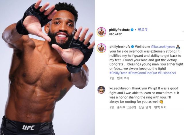 이에 고석현은 "고맙다 필립. 정말 좋은 경기였고, 많은 걸 배울 수 있었다. 당신과 옥타곤을 함께한 것은 영광이었다. 앞으로도 당신을 응원하겠다"고 답했다.