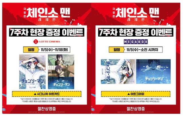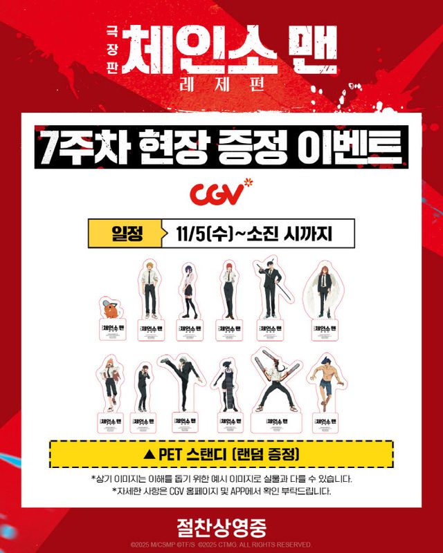 식지 않는 관객들의 성원에 힘입어 ‘극장판 체인소 맨: 레제편’은 개봉 7주차에도 풍성한 현장 증정 이벤트를 준비했다. 먼저 오는 5일부터는 CGV에서 관람객 대상 선착순으로 ‘PET 스탠디’(12종 중 랜덤 1종)가 증정된다. 이번 굿즈는 포치타, 덴지, 레제, 마키마, 아키, 천사 등 주요 캐릭터 12종이 포함되어 있다.