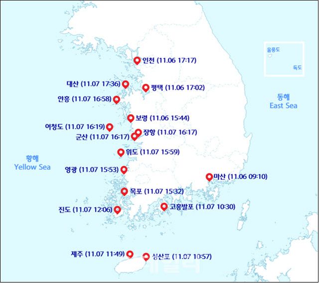특히 인천 연안부두, 보령 오천항, 군산 내항, 진도 수품항, 제주 성산포 인근 저지대 등 일부 지역에서는 만조 시 일시적인 침수가 발생할 수 있다.