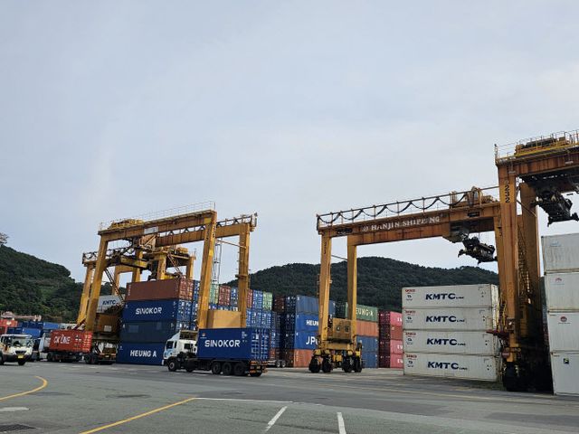 최근 6~7월에는 트럼프 행정부의 대미 수출 물량 관세 부과를 앞두고 화물이 몰리며 장치율이 일시적으로 치솟았다는 게 현장 설명이다. 현재는 물동량이 다소 안정된 상태다. 다만 선박 입·출항이 집중되는 금요일과 주말은 여전히 터미널이 바쁘게 돌아간다. 배 한 척은 보통 12~36시간 머물며 작업을 마치고 다시 항로에 오른다.
