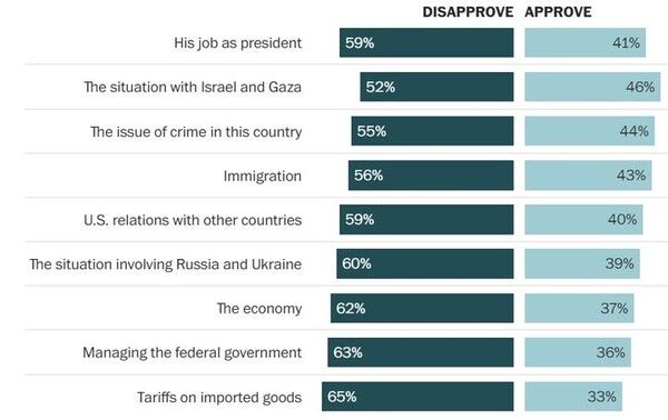 이번 조사에서 경제, 이민, 관세, 연방 정부 운영, 범죄 대응, 국제관계, 중동 및 우크라이나 분쟁 등 8개 사안 모두에 대해 부정적인 평가가 많았다.