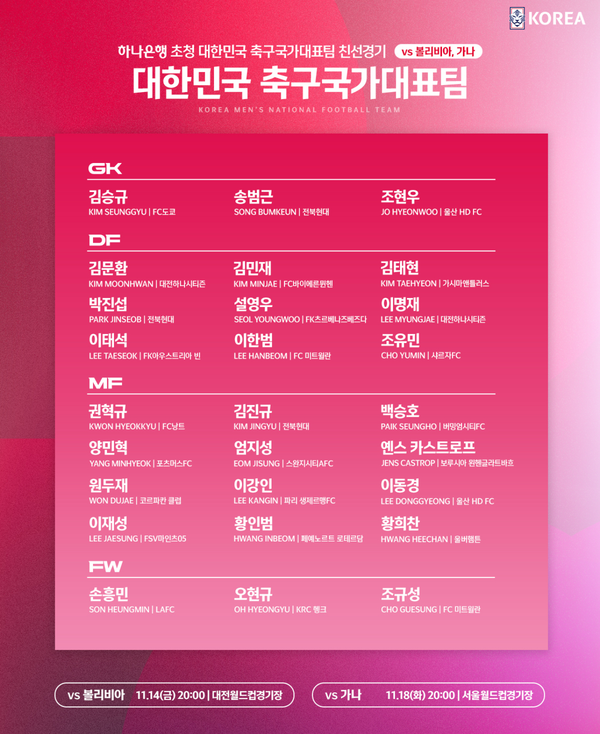 이번 소집 명단에는 손흥민(LAFC)을 비롯해 이재성(마인츠), 김민재(바이에른뮌헨), 이강인(파리생제르맹) 등 지난 10월 중용된 유럽파들이 그대로 이름을 올렸다. 대표팀에 꾸준히 합류해 온 이동경(울산HD)과 박진섭, 김진규(이상 전북현대), 이명재, 김문환(이상 대전하나시티즌) 등 K리거들도 11월 소집 훈련에 함께한다.