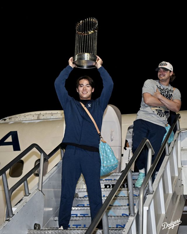 다저스는 3일(한국시간) 구단 공식 SNS에 야마모토가 우승 트로피를 들고 항공기 계단에 서 있는 사진을 공개했다.