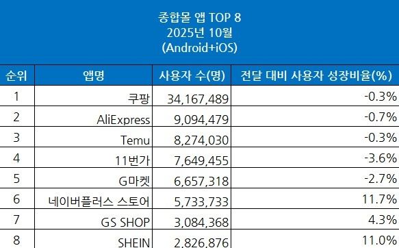 11번가, G마켓의 이용자 수도 각각 3.6%, 2.7% 줄었으나 네이버플러스스토어는 11.7% 증가한 573만3733명을 기록했다. GS SHOP도 이용자 수가 4.3% 늘었다.