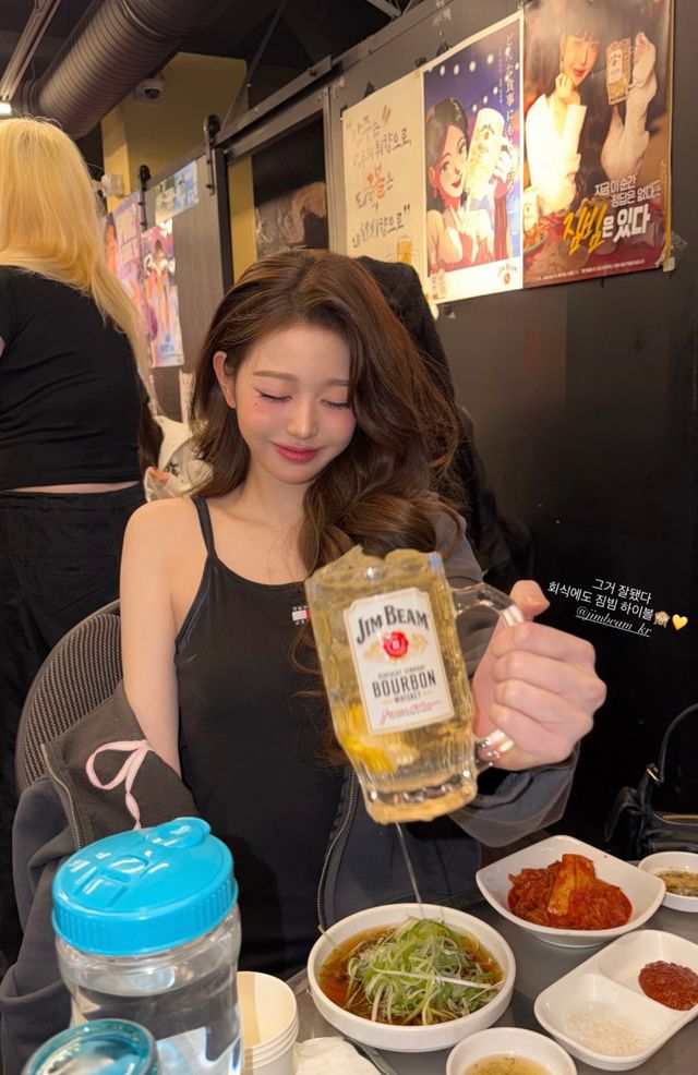 장원영은 3일 자신의 인스타그램 스토리에 “그거 잘됐다 회사에도 짐빔 하이볼💛”이라는 글과 함께 한 장의 사진을 게재했다.