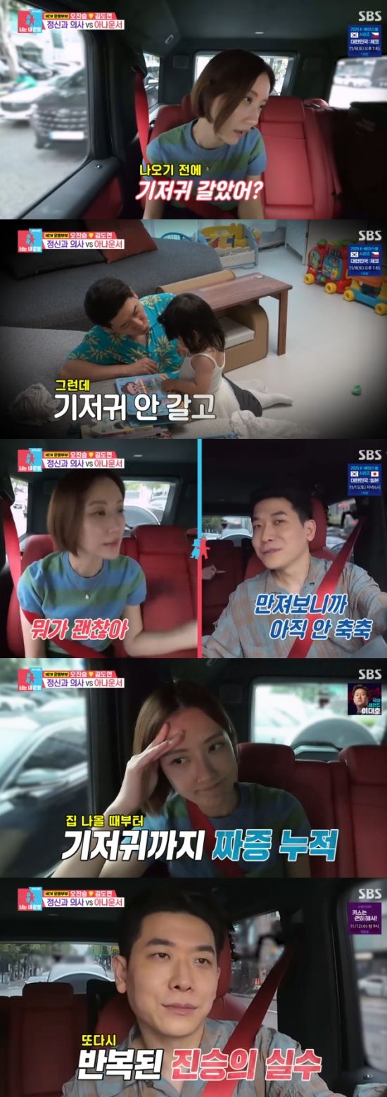 하지만 차에서 딸이 칭얼거리기 시작했다. 기저귀를 만져보니 기저귀가 빵빵한 상황. 김도연은 기저귀를 갈았는지를 물었고, 오진승은 "안 갈았다"고 답했다.