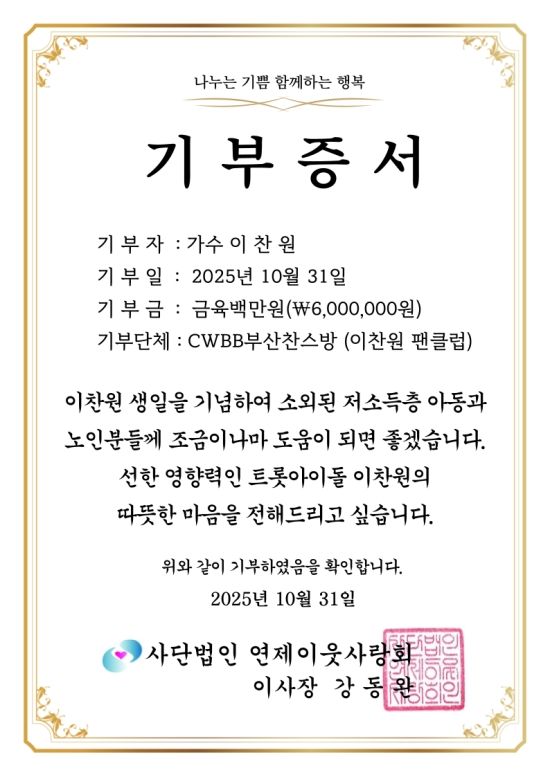 최근 이찬원 팬클럽 'CWBB부산찬스방'은 가수의 생일(11월 1일)을 기념해 사단법인 연제이웃사랑회에 600만 원을 기부했다고 밝혔다.