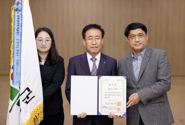 | ▲ 표창장 수여(왼쪽부터 주인순 주무관, 김문근 단양군수, 백승권 기획팀장) |