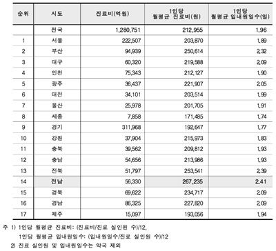 전남이 2.41일로 가장 많았고, 전북 2.39일, 부산 2.32일, 경북과 경남이 각각 2.09일로 뒤를 이었다.