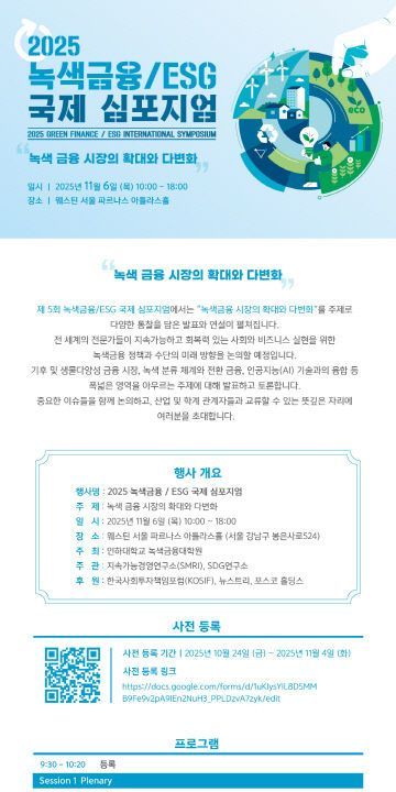 인하대학교 녹색금융대학원이 오는 6일 더 웨스틴 서울 파르나스 호텔에서 '녹색금융·ESG 국제 심포지엄'을 개최한다.