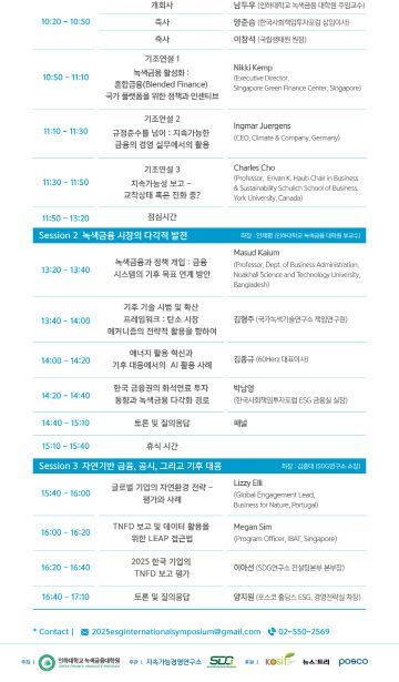 국내외 학계 연구자와 산업계 실무자들이 참여하는 발표 세션에서는 총 7개의 주제 발표와 패널 토론이 진행된다. 대표적으로 '녹색금융 시장의 다각적 발전(Diversified Development of Green Finance Markets)' 세션에서는 기후 목표 달성을 위한 인공지능 등 다양한 기술의 활용과 금융 부문의 노력을 다룬다.