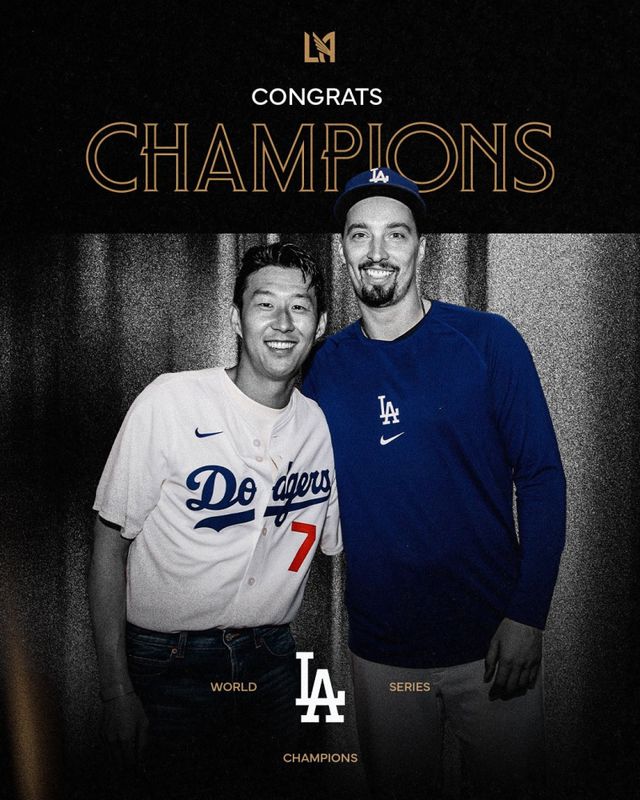 정확히는 LAFC의 게시물을 LA 다저스가 '재게시'한 사진이긴 했다. LAFC가 다저스의 WS 우승을 축하하는 게시글을 SNS에 올렸고, 이 과정에서 다저스 유니폼을 입고 있는 손흥민과 다저스 투수 블레이크 스넬이 함께 찍힌 사진을 대표로 택해 올린 것이다.