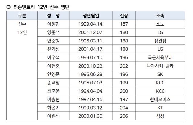 대한민국농구협회는 4일 중국과의 2연전으로 치러지는 FIBA 월드컵 아시아예선에 출전할 남자 국가대표 12명의 명단을 공개했다.