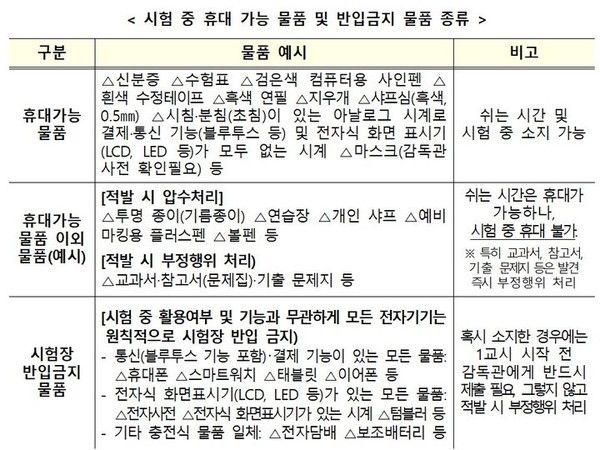 보청기, 돋보기, 연속혈당측정기 등 개인의 신체조건 또는 의료상 특별한 이유로 휴대가 필요한 물품은 매 교시 감독관의 사전 점검을 거친 후 휴대할 수 있다.