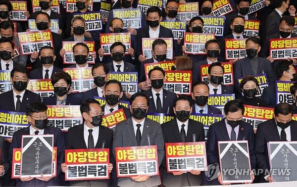 국민의힘은 이날 오전 이 대통령의 시정연설 직전, 국회 본회의장 앞 로텐더홀에서 '야당탄압 불법특검' 규탄대회를 열고 국회 본관에 들어서는 이 대통령을 향해 "재판 속개하라"고 목소리를 높혔다.
