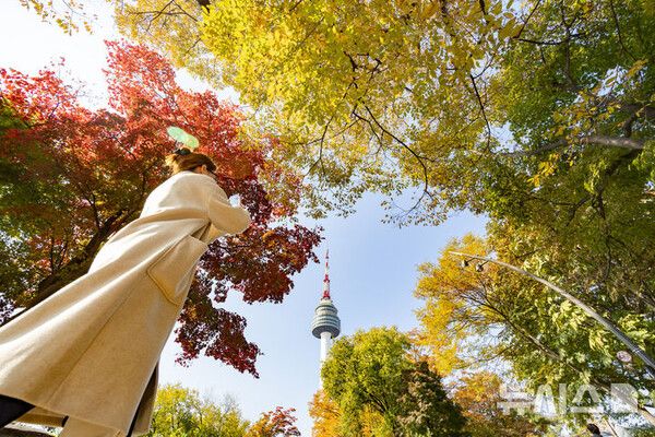[서울=뉴시스] 완연한 가을 날씨를 보인 4일 서울 중구 남산을 찾은 시민들이 단풍길을 걷고 있다.