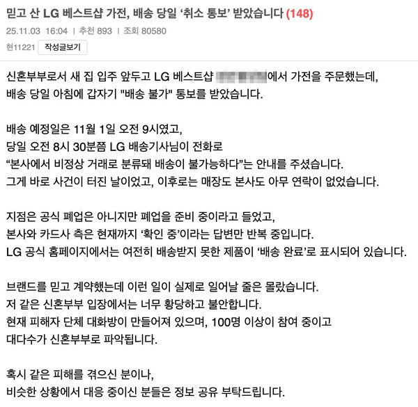지난 3일 올라온 LG전자 베스트샵 신혼부부 피해 호소 게시글. /온라인 커뮤니티 갈무리