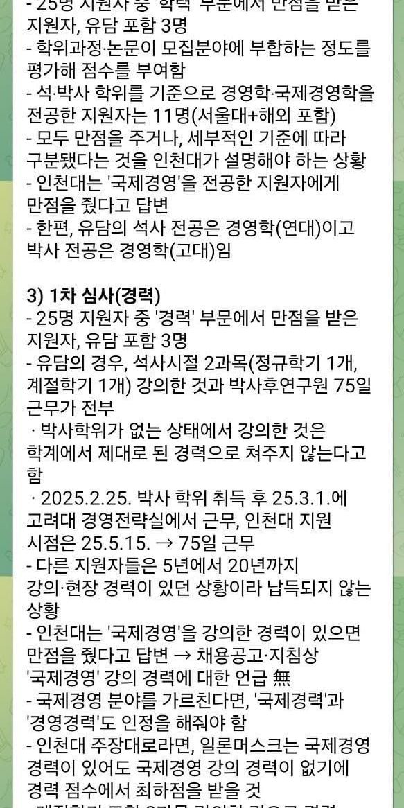 - 다른 지원자들은 5년에서 20년까지 강의·현장 경력이 있던 상황이라 납득되지 않는 상황