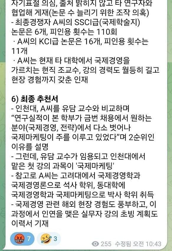 - 인천대, A씨를 유담 교수와 비교하며 “연구실적이 본 학부가 금번 채용에서 원하는 분야(국제경영, 전략)에서 다소 벗어나 국제마케팅이 주를 이루고 있었다”며 2순위인 이유를 설명
