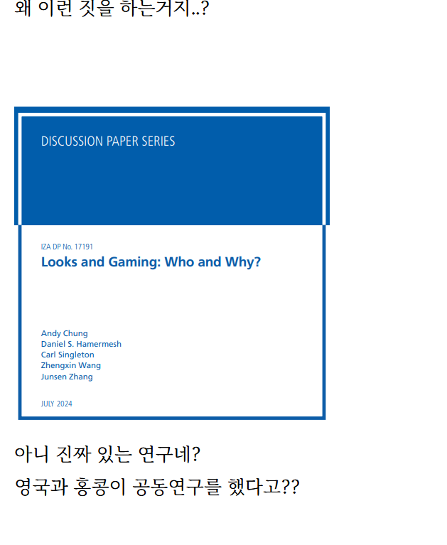 Looks and Gaming: Who and Why? — Andy Chung, Daniel S. Hamermesh, Carl Singleton, Zhengxin Wang, Junsen Zhang. IZA Discussion Paper No. 17191 (2024) 및 NBER Working Paper No. 32809 (2024).