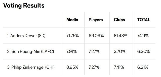MLS 사무국은 5일(한국시간) 올해의 신인상 수상자로 샌디에이고FC의 앤더슨 드레이어를 선정했다고 밝혔다. 드레이어는 미디어와 구단, 선수단이 참여한 투표에서 74%의 높은 지지를 받아 6% 득표에 그친 손흥민을 제치고 수상의 영예를 안았다.
